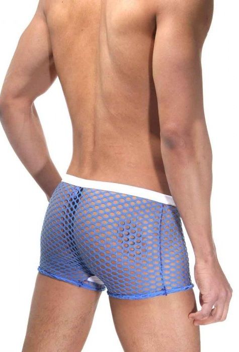 Трусы-боксеры из крупной эластичной сетки синего цвета. Боксеры на широкой белой резинке, имеют спереди гладкую плотную вставку.
