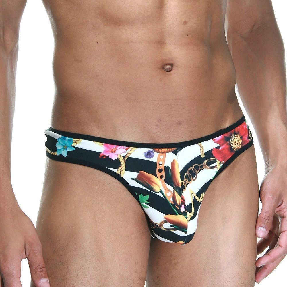 Стильные черно-белые трусы-тонги с принтом в виде цветов и цепей.