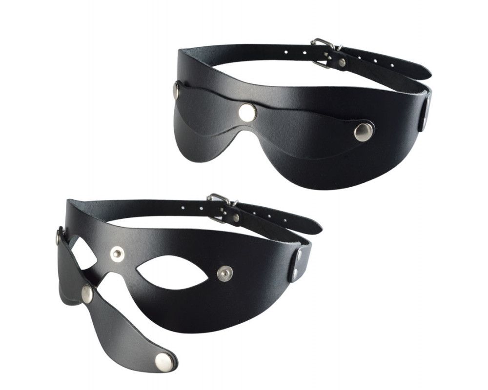 Маска выполнена из натуральной кожи и имеет съемные шоры на кнопках. Регулируется при помощи пряжки. Минимальный обхват головы - 53 см, максимальный - 62 см.