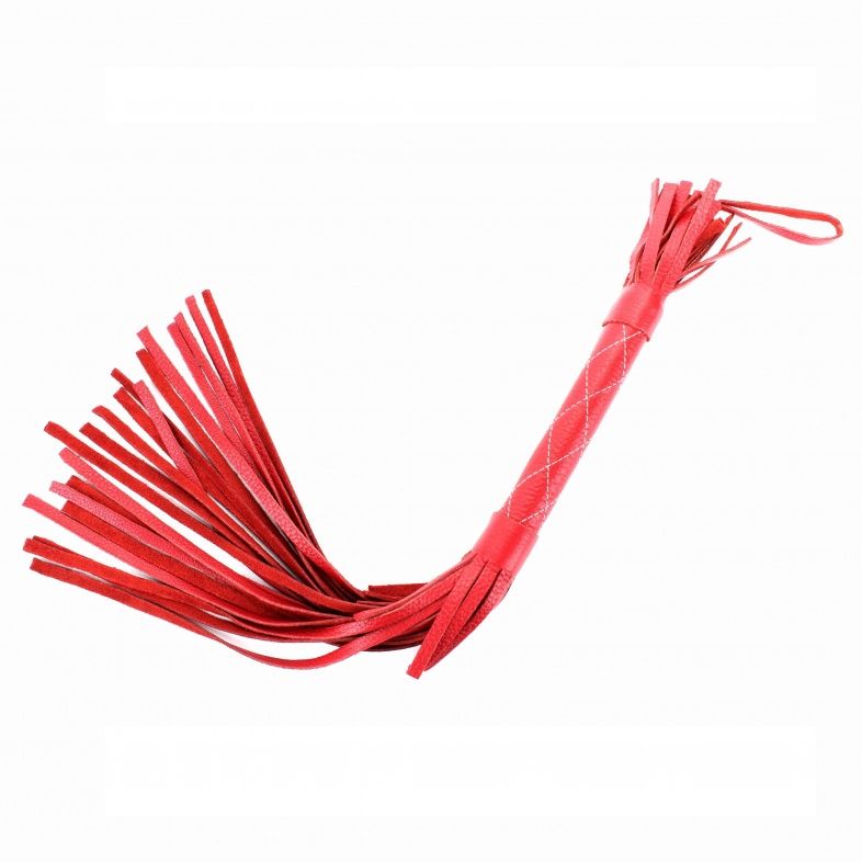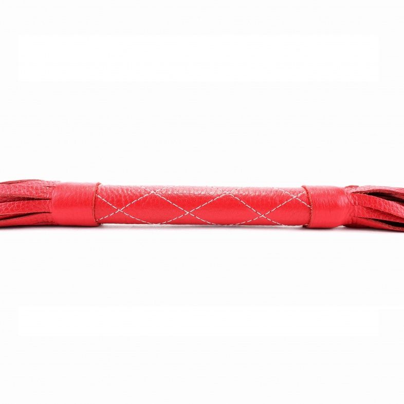 Аккуратная красная плетка, изготовленная из натуральной кожи. Имеет жесткую ручку, также покрытую кожей и простроченную белыми нитями. Имеется петля для удобного использования плети. Длина ручки - 17 см. Длина хлыстов - 27 см.