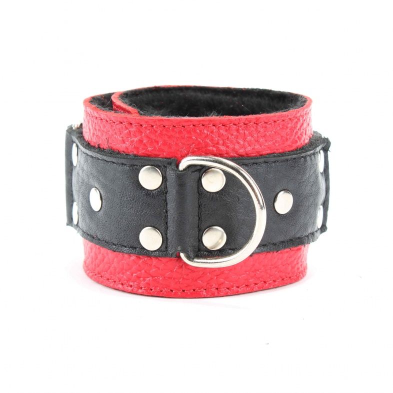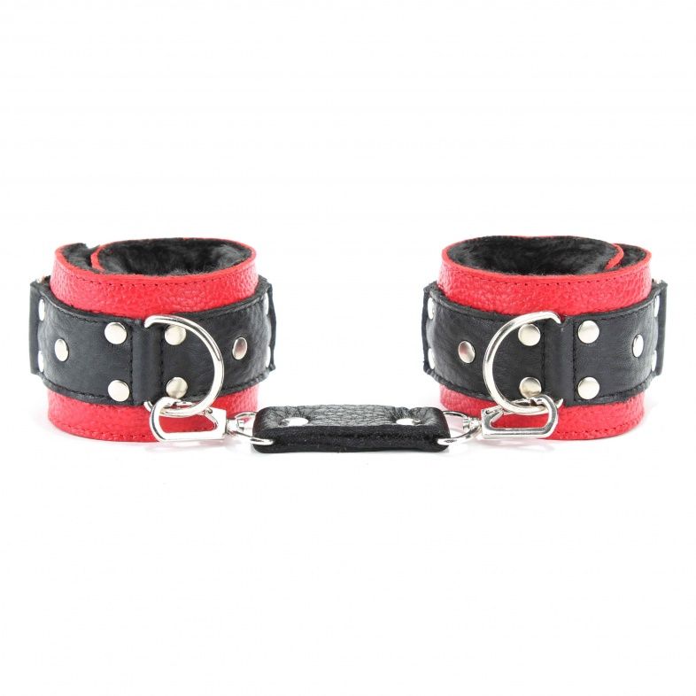 Кожаные наручники красного цвета. Украшены заклепками и соединяются между собой цепью с карабинами. Имеет вставку черного цвета на лицевой части и отделаны мехом с внутренней части. Размер наручников регулируется при помощи застежки-липучки. Ширина - 5 см. Длина цепочки - 15,5 см.