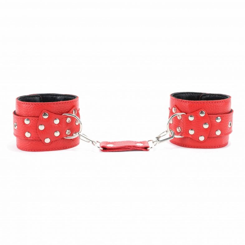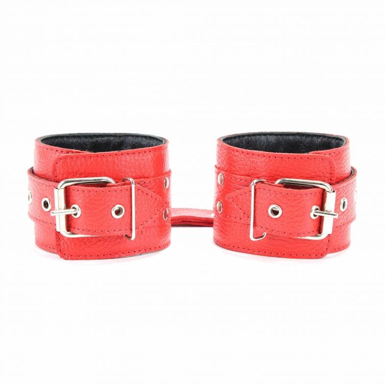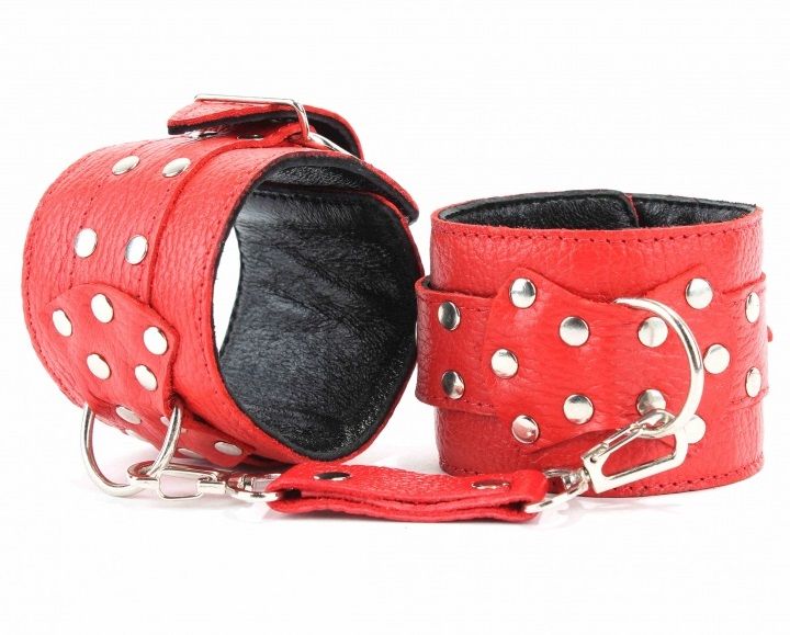 Оковы из красной кожи можно использовать для рук или ног. Верхний слой мягкий кожаный, нижний – велюр. Чтобы секс-наручники не натирали, слои между собой проклеены мягкой прокладкой. Прочные оковы из красной кожи надежно сцеплены металлической цепью, с внешней стороны украшены фурнитурой – кнопками. Секс-наручники надежно фиксируют руки за счет ремней, партнерша будет только Вашей! Длина цепочки – 15 см.