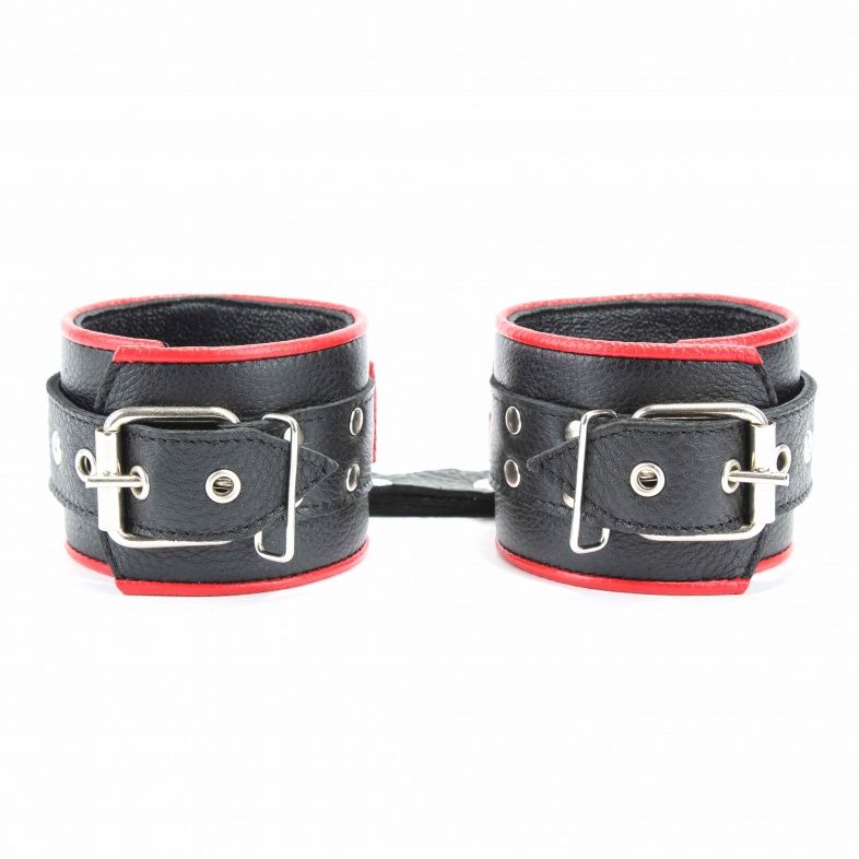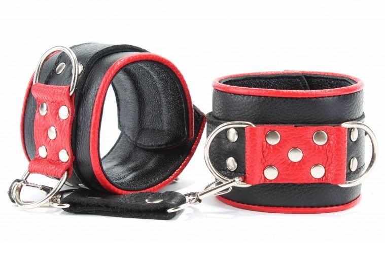 Сильные наручники в красно-черном цвете. Украшены заклепками и соединяются между собой цепью с карабинами. Размер наручников регулируется при помощи застежки. Ширина - 6 см. Длина цепочки - 13 см.