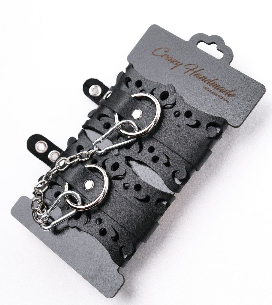 Наручники из кожи с узорами. Наручники имеют кольца для крепления и металлическую сцепку.Характеристики