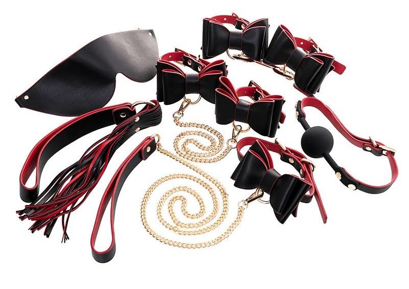 Милый бондажный набор с аксессуарами в виде бантиков-бабочек. Прекрасная идея для пар, которые хотят повысить свой уровень в доминировании и подчинении. В комплект входят все базовые атрибуты БДСМ. Их можно использовать как все вместе, так и по отдельности, в зависимости от смены ролей, сценариев и мизансцен. В сумке: маска, наручники, поножи, кляп, ошейник, плетка. В наборе: маска, наручники, поножи, кляп, ошейник, плетка. Размеры сумки - 32 х 15 х 11 см. Длина кляпа - 59 см., диаметр шара - 4 см. Длина маски - 65 см., ширина - 8 см. Длина плети - 47 см. Длина ошейника - 42 см., поводка - 114 см. Длина наручников - 24,5 см. Длина наножников - 29 см.