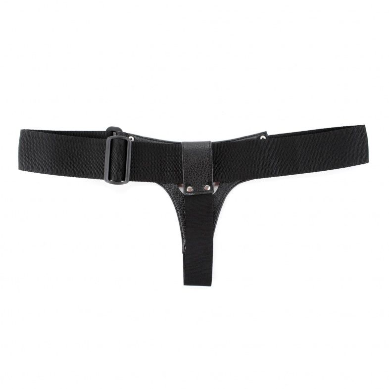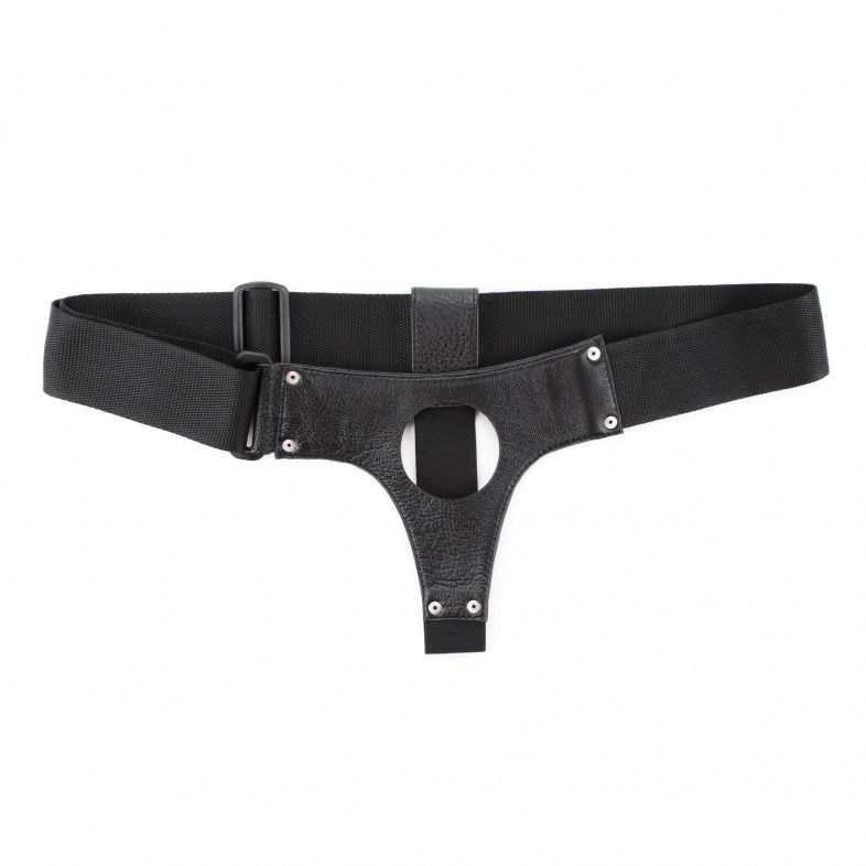 Трусики для страпона, изготовлены из кожи. Крепятся при помощи широких лент. Размер легко меняется при помощи застежки. Диаметр отверстия для страпона - 5,5 см.