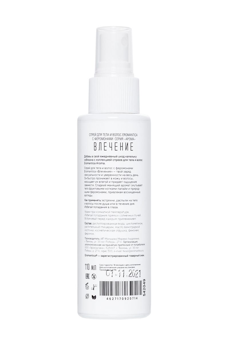 В секс-шопе Orgasmix вы можете купить Спрей для тела и волос Eromantica «Влечение» - 110 мл. артикул 298460 по цене руб. с доставкой в город Комсомольск-на-Амуре. Мы осуществляем доставку по всей России. Ближайшая дата отправки этого товара . Заказы принимаются круглосуточно через интернет-магазин.