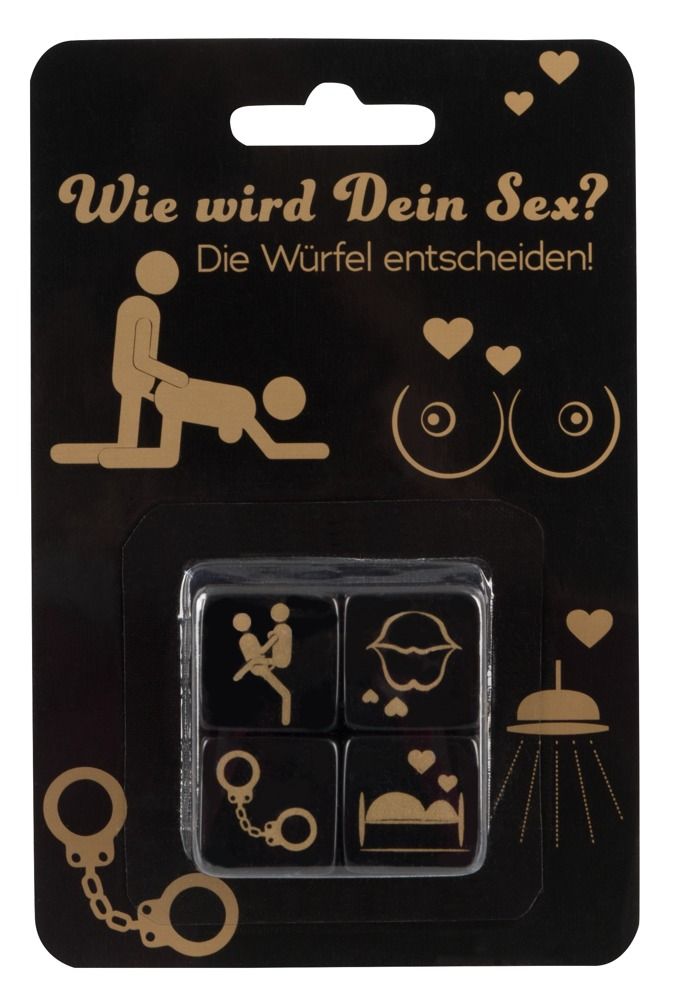 Игральные кубики - 4 штуки в наборе. С золотистым принтом. Мотивы - позиции, место, аксессуары и область тела.