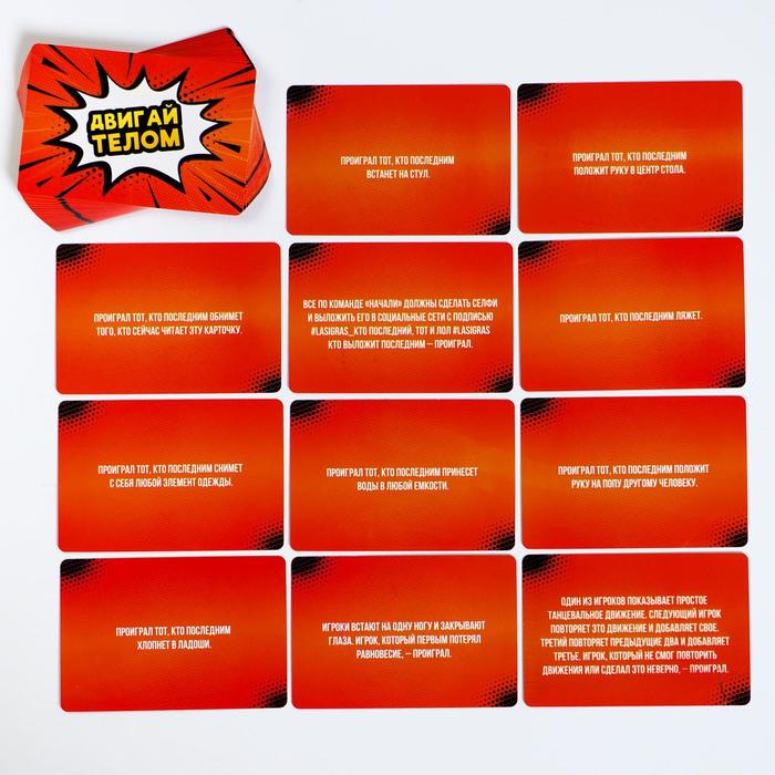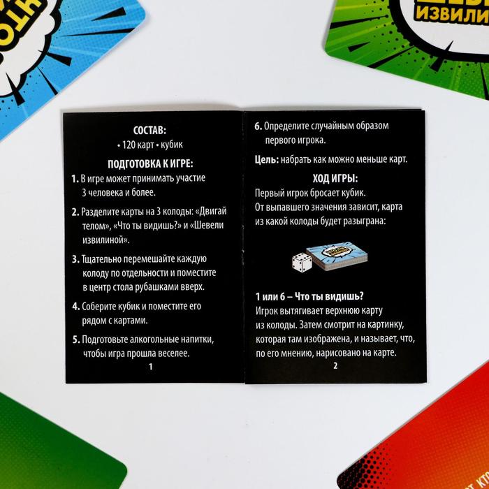 Это больше, чем просто фанты! Пора выяснить, кто в вашей компании самый сообразительный, быстрый и креативный. Может, это вы? Или сосед слева? Выполняйте задания с карточек, а тот, кто долго думает или действует медленнее остальных, получит штраф… в виде горячительного напитка! Как играть? Для начала разделите карты на 3 колоды: «Двигай телом», «Что ты видишь?» и «Шевели извилиной». Кубик поместите рядом с колодами. Осталось только определить очерёдность хода и начать игру! Далее игроки по очереди бросают кубик. От выпавшего значения зависит, из какой колоды будет разыграна карта: 1 или 6 — «Что ты видишь?» Игрок вытягивает верхнюю карту из данной колоды, смотрит на картинку, которая там изображена, и называет, что, по его мнению, нарисовано на карте. Как только он озвучил свой ответ, следующий игрок по часовой стрелке берёт эту же карту и называет, что это. Повторяться нельзя. И далее по кругу. Тот, кто в течение трёх секунд не может назвать, что изображено на карте, забирает её себе и выпивает. 2 или 5 — «Двигай телом» Игрок вытягивает верхнюю карту из данной колоды и зачитывает задание. Все остальные игроки, кроме того, кто зачитывал задание, выполняют его. Тот, кто последним выполнил задание, забирает карту себе и выпивает. 3 или 4 — «Шевели извилинами» Игрок вытягивает верхнюю карту, зачитывает задание и первым начинает его выполнять. Как только он озвучил свой ответ, следующий игрок по часовой стрелке берёт эту же карту и выполняет задание. Повторяться нельзя. И далее по кругу. Тот, кто в течение трёх секунд не может назвать, что изображено на карте, забирает её себе и выпивает. Затем данный игрок бросает кубик и вытягивает карту из соответствующей колоды. Игра заканчивается по желанию игроков. Далее участники подсчитывают карты, полученные в течение игры. Тот, у кого их меньше всего, победил! В комплекте: 120 карт, игральный кубик, правила игры.