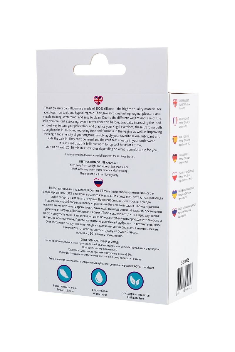 Набор вагинальных шариков Bloom от LEroina изготовлен из нетоксичного и гипоаллергенного 100% силикона высокого качества. На конце есть петля, позволяющая легко вводить и извлекать игрушку. Водонепроницаемы и просты в уходе. Идеальный способ попрактиковать упражнения Кегеля. Благодаря шарикам разной тяжести вы можете начать тренировки, даже если никогда этого не делали, постепенно увеличивая нагрузку. Вагинальные шарики LEroina укрепляют ЛК-мышцы, улучшают тонус и упругость мышц влагалища, а также помогают увеличить продолжительность и интенсивность оргазмов. Они абсолютно бесшумны, а петлю для извлечения легко спрятать в нижнем белье. Рекомендуется использовать игрушку не более 2 часов, начиная с 20-30 минут ежедневно. Длина большого шарика - 13,5 см., диаметр - 3,1 см. Длина среднего шарика - 10,5 см., диаметр - 3,1 см. Длина маленького шарика - 10,5 см., диаметр - 3,1 см.