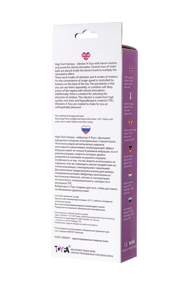 High-Tech fantasy - вибратор A-Toys с функцией вращения и мощным клиторальным стимулятором. Несколько рядов металлических шариков многократно увеличивают возбуждающий эффект. Игрушка имеет не только 8 режимов вибрации, но и 4 режима ротации, скорость которых удобно управляется кнопками на рукояти игрушки. Особенность в том, что вы можете использовать их отдельно, или же совмещать мягкое воздействия на стенки влагалища с клиторальной стимуляцией. Дополнительно предусмотрена кнопка для выбора направления ротации. Рабочая длина - 11,2 см.